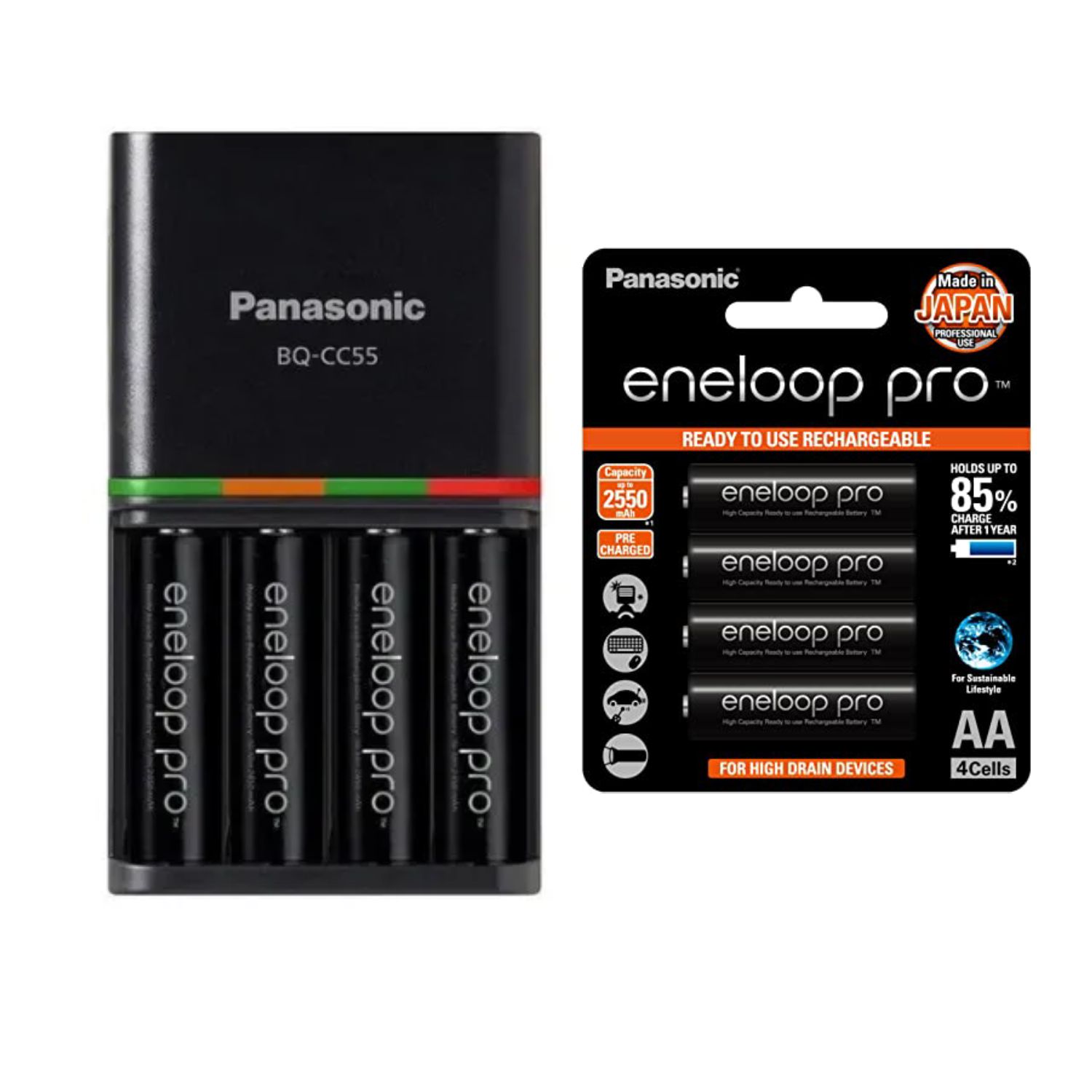 Carregador Rápido da Panasonic Eneloop Advanced BQ-CC55 - Carregador inteligente e automático, faz a carga apenas da energia remanescente. Exemplo: Ao colocar uma pilha com 30% de energia, ele completa apenas os 70% restantes. - Carrega até 4 pilhas AA/AAA do tipo NiMH. - Possui LED indicador para cada pilha. - Possui avançada tecnologia de carregamento rápido. - Canais individuais. - Detecção de pilha alcalina. - Detecção de pilha com defeito ou com a vida útil esgotada. - MODELO: BQ-CC55 - TEMPO MÉDIO DE CARGA: 1.5h – 4hrs - SAÍDA: 1.5V 750mA x 4 (tamanho AA) 1.5V 275mA x 4 (tamanho AAA) - VOLTAGEM (VOLTS): Bivolt (110 / 220 volts) >> Carregue rapidamente até 4 pilhas O carregador de pilhas BQ-CC55 foi projetado para carregar todas as pilhas recarregáveis (NiMH) com rapidez, segurança e eficiência. Dependendo do modelo e das condições da pilha, o tempo de recarga poderá ser alterado. O carregador suporta carregar todas as pilhas Ni-MH, independente da capacidade (mAh). >> Tempo de recarga - Carregador com 1 ou 2 pilhas - AA: 2400 - 2600 mAh = 2 h. - AA: 1900 - 2000 mAh = 1.5 h. - AA: 900 - 1000 mAh = 0.75 h. - AAA: 900 - 950 mAh = 2 h. - AAA: 750 - 800 mAh = 1.5 h. - AAA: 550 - 650 mAh AA = 1.25 h. >> Tempo de recarga - Carregador com 3 ou 4 pilhas - AA: 2400 - 2600 mAh = 4 h. - AA: 1900 - 2000 mAh = 3 h. - AA: 900 - 1000 mAh = 1.5 h. - AAA: 900 - 950 mAh = 4 h. - AAA: 750 - 800 mAh = 3 h. - AAA: 550 - 650 mAh AA = 2.5 h.